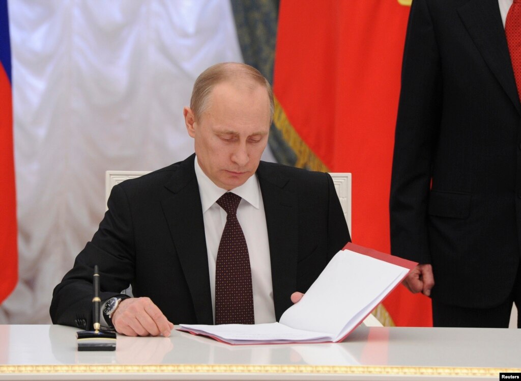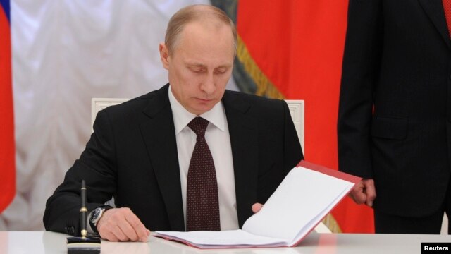Russian President Vladimir Putin prepares to sign a law on ratification of a treaty making Crimea part of Russia, March 21, 2014